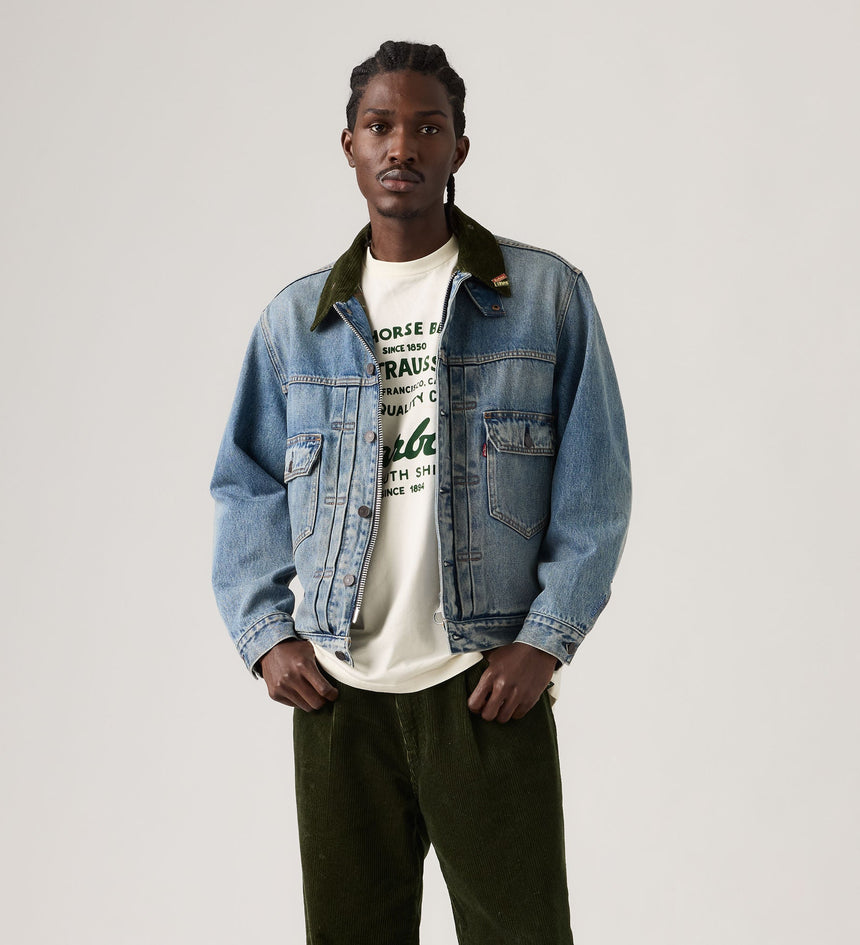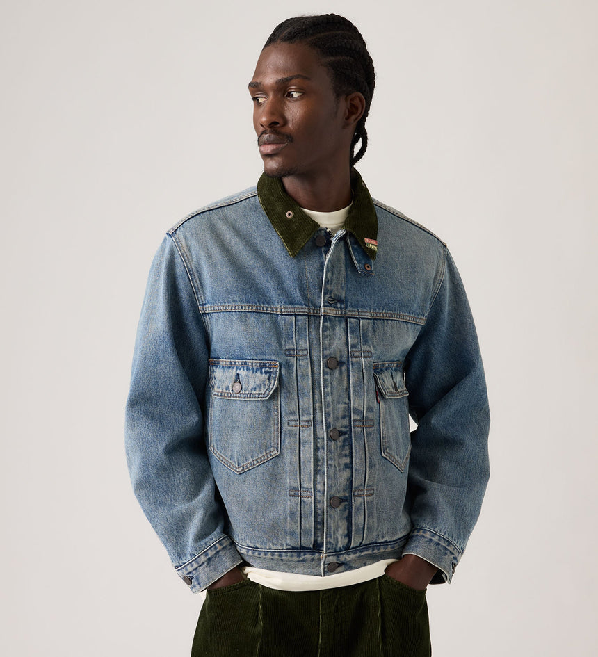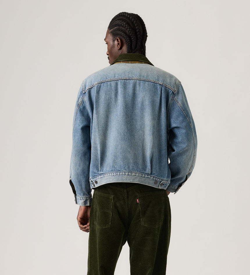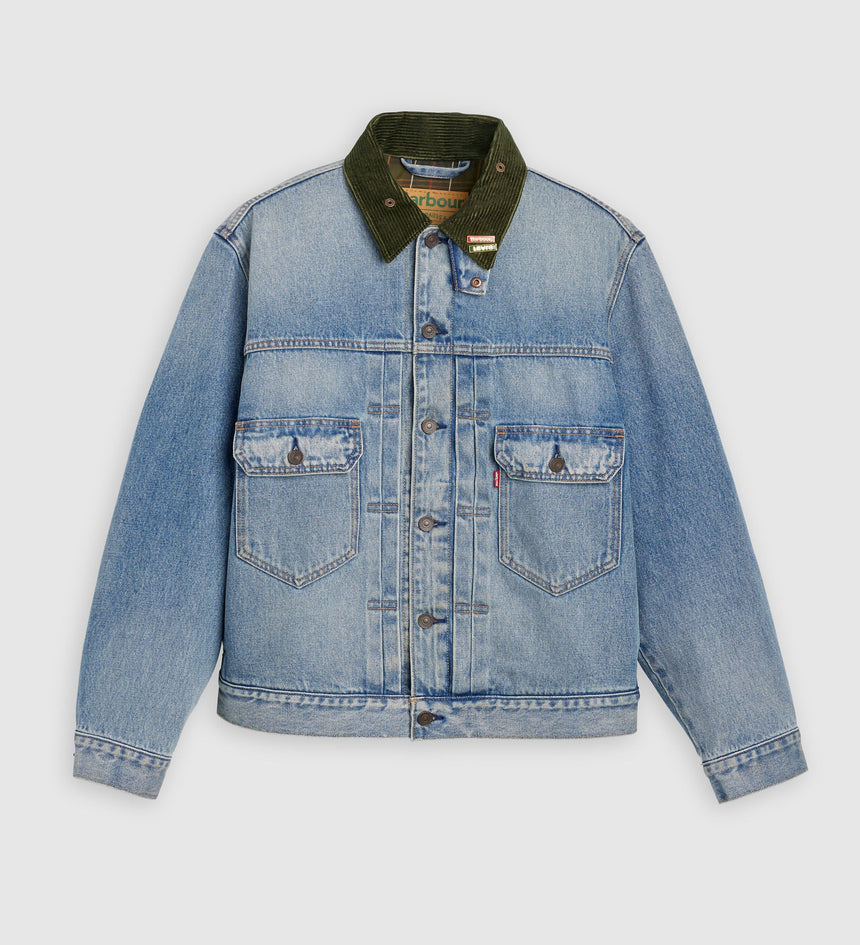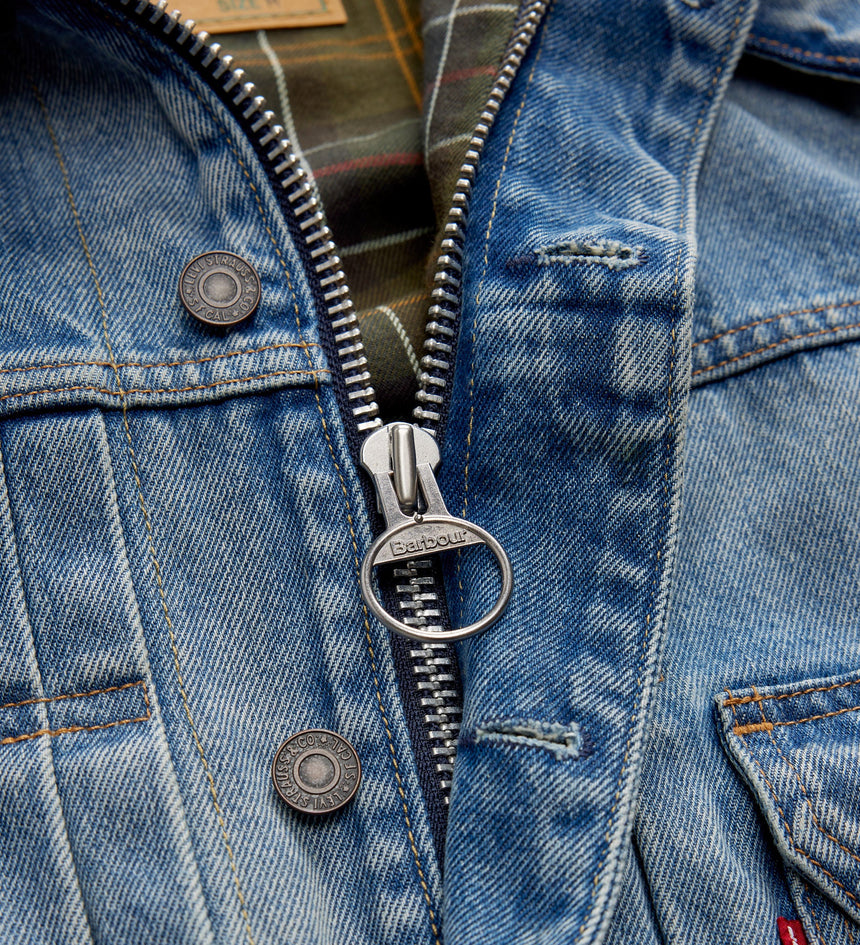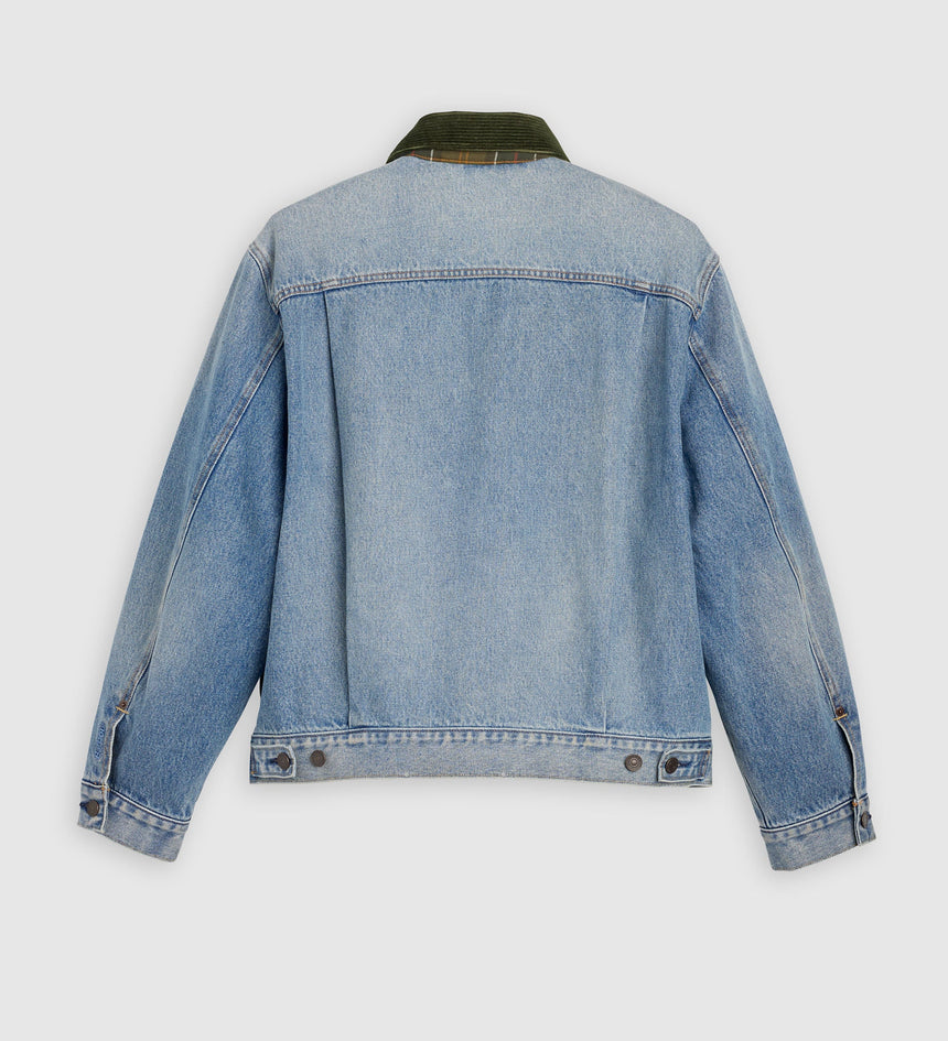 We teamed up with iconic brand Barbour to showcase exceptional craftsmanship and individuality where tough Levi's® denim meets signature Barbour details. This Type II Trucker Jacket combines Barbour's iconic trims and details with our timeless staple. Cut with a shorter length, it features unique pleated detailing paired with Barbour's iconic two-way ring pull zip, tartan lining and a corduroy collar.