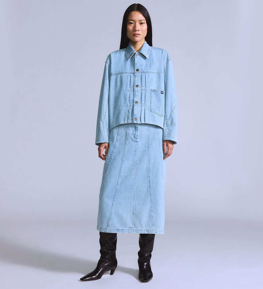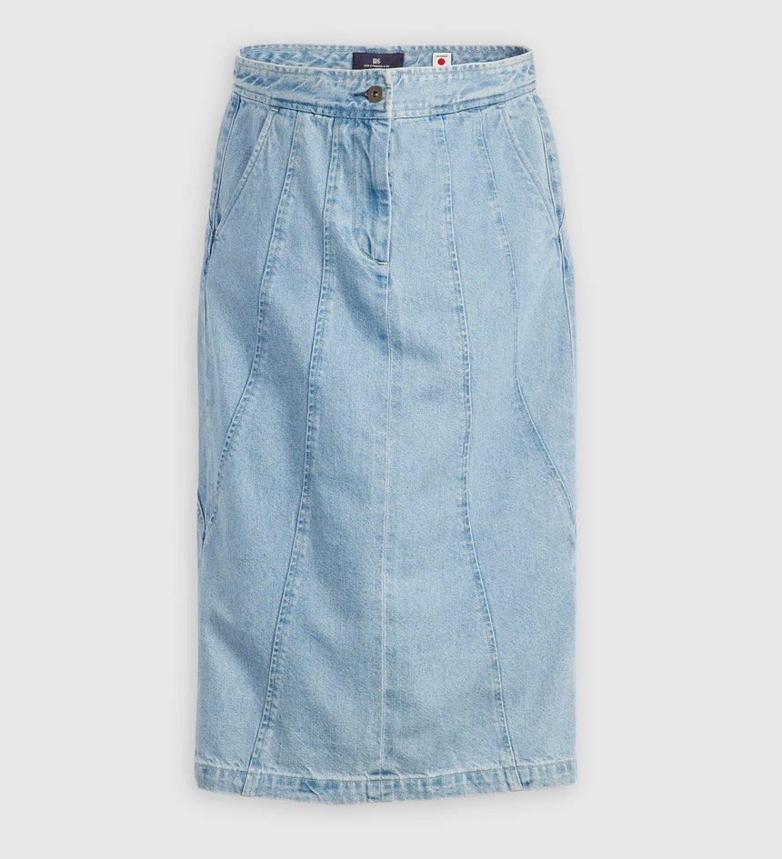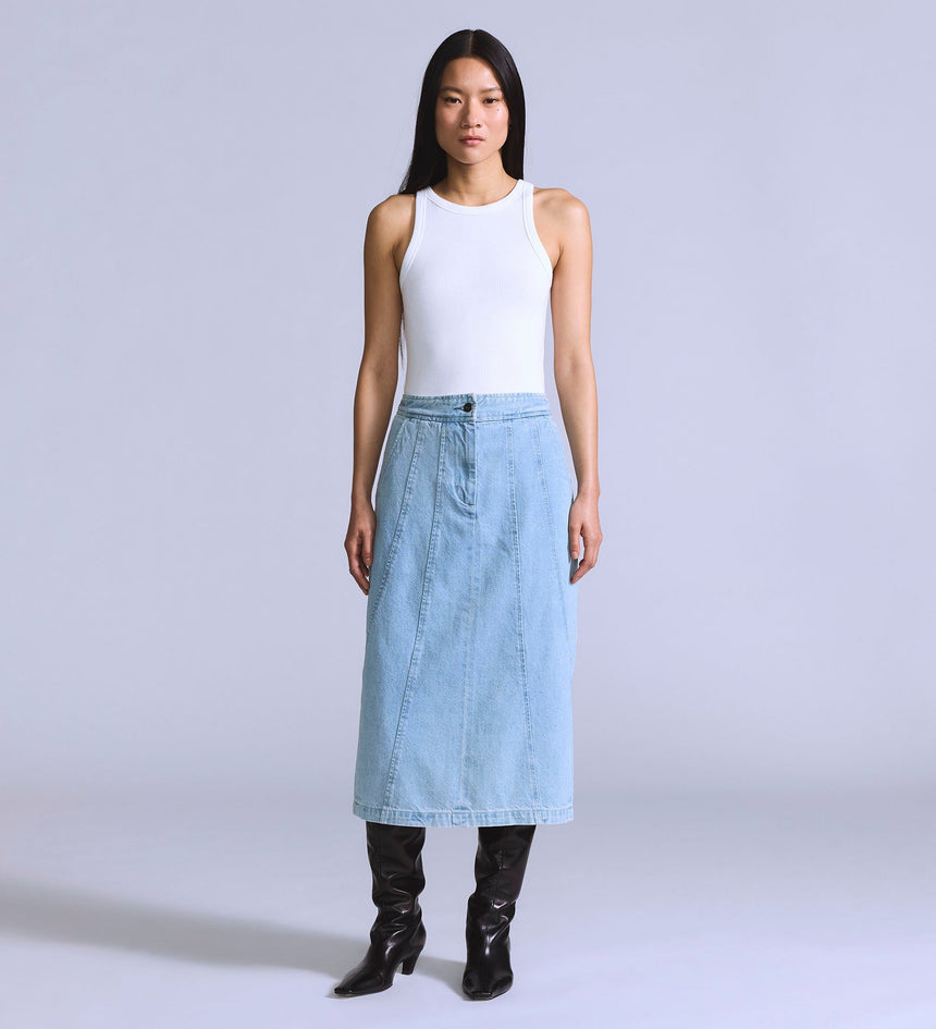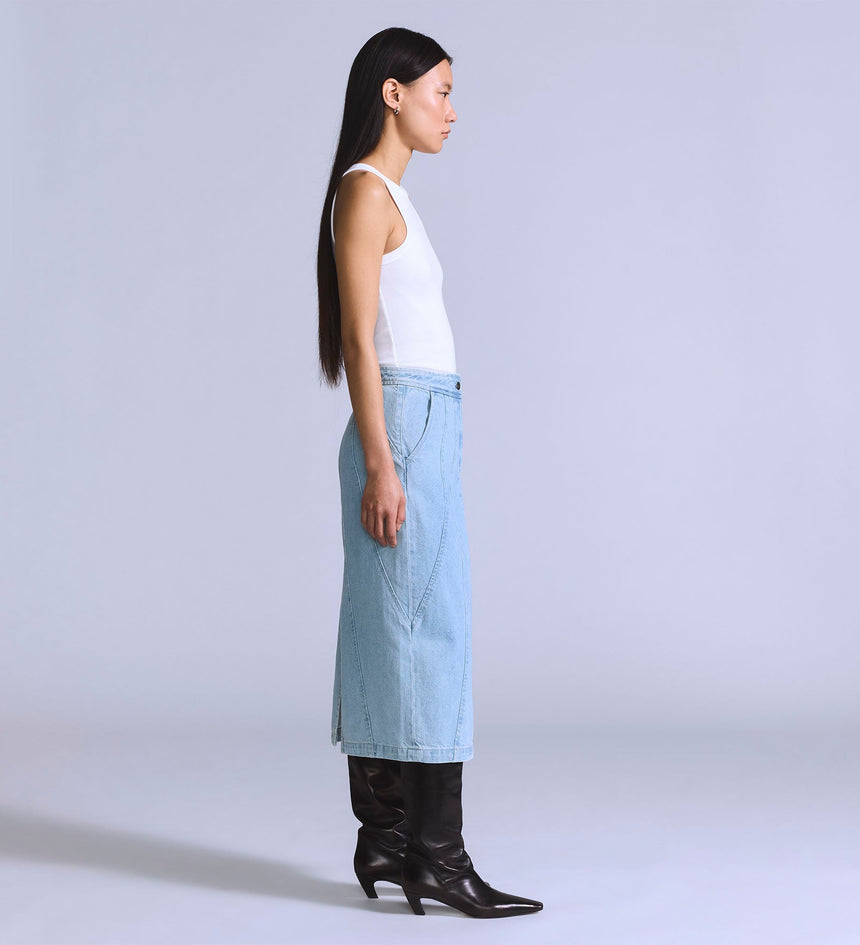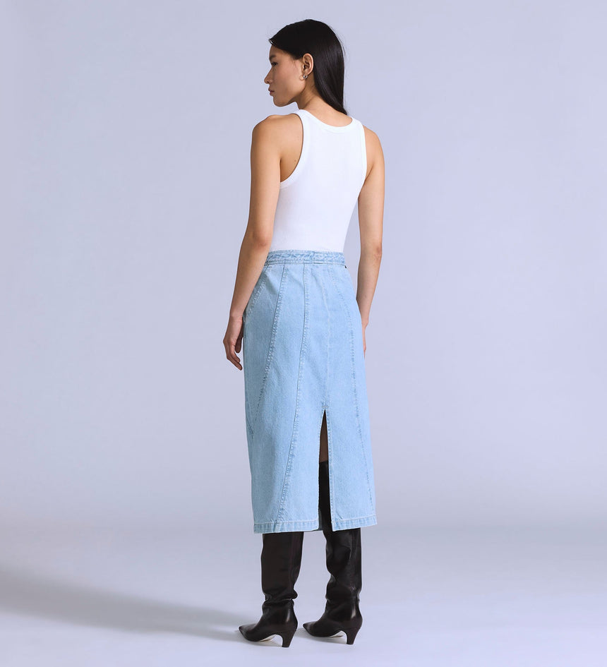 Levi's® Blue Tab™ is an elevated collection that infuses our iconic denim heritage with traditional craftsmanship. Expect thoughtful details, sharp tailoring and finishes that are rich with character. This is an entirely new shape of Blue. Add a little structure with our Seamed Skirt. This piece features a high rise, a perfect midi length and is finished with ultra-flattering seam...